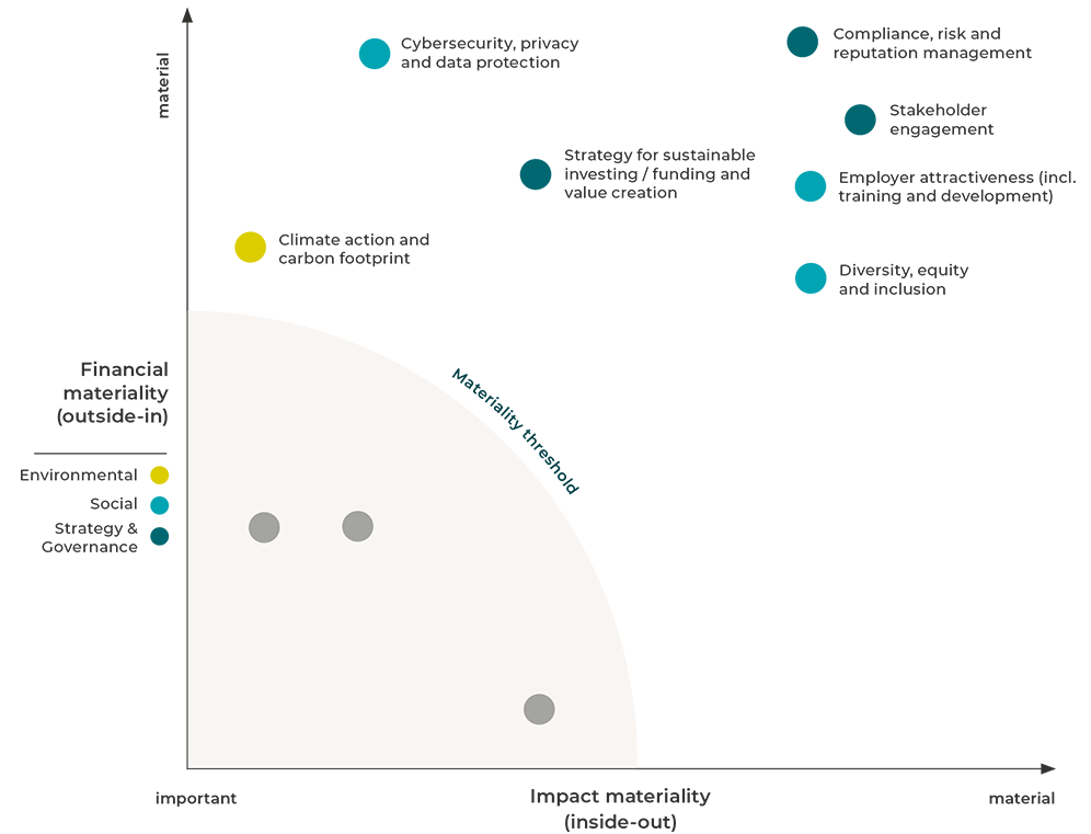 We have also determined material topics at portfolio level as part of a double materiality analysis. Alongside climate action, other topics such as diversity, equity & inclusion and sustainable supply chain are in particular focus. All material topics as well as targets, actions and KPIs are described in detail in our 2023 Sustainability Report.